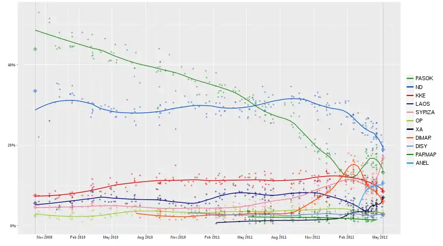 The May 2012 Greek legislative election was held in Greece on Sunday, 6 May, to elect all 300 members to the Hellenic Parliament. It was regular scheduled to be held in late 2013, four years after the previous election; however, an early election was stipulated in the coalition agreement of November 2011 which formed the Papademos Cabinet. The coalition comprised both of Greece's traditional major political parties, PASOK on the left and New Democracy (ND) on the right, as well as the right-wing Popular Orthodox Rally (LAOS). The aim of the coalition was to relieve the Greek government-debt crisis by ratifying and implementing decisions taken with other Eurozone countries and the International Monetary Fund (IMF) a month earlier.[1]