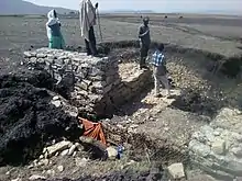The most common structure to control gullies in this catchment is the check dam. However, there are several problems with collapsing check dams, even if they are built in a correct way, using well-shaped stones and having spillway and apron. One problem is in the Vertisol areas, such as near May Be’ati village in the upper catchment: sometimes the check dam stands intact and the water creates a new gully around it. The reasons are the cracks occurring in Vertisols: the water that accumulates behind the dam will start flowing through the cracks; it will round the dam and create an underground tunnel that becomes wider and wider until collapse. To control this, simple and cheap subsurface dams were implemented around 2010. Trenches, 2.5 meter deep and 25 meter long, were excavated at both sides of a check dams and a heavy plastic sheet (geomembrane) inserted vertically, after which the trench was filled with soil. The plastic sheet prevents water from flowing underground through the cracks. No more bypass occurs, and the water table is raised.[9]