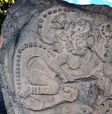The Jaguar God of Terrestrial Fire is recognizable by a 'cruller' around the eyes (making a loop over the nose), jaguar ears, and fangs. He personifies the number seven, which is associated with the day Akʼbʼal ('Night'). Usually called 'Jaguar God of the Underworld', he has been assumed to be the 'Night Sun' - the shape supposedly taken by the sun (Kinich Ahau) during his nightly journey through the underworld - by reason of having the large eyes and filed incisors that also occur with the sun deity, and of sometimes evincing a k 'in infix. The deity's hypothetical aspect of a nocturnal sun (that is, a subterranean fire) should perhaps be connected to his proven association with terrestrial fire. He is often represented on incense burners and connected to fire rituals,[4] while his 'cruller' may represent a cord used in making fire with a stick (Taube). Moreover, vases in codical style show him, captured, about to be burnt with torches. The nocturnal sun hypothesis is complicated by this very incident, and even more so by the fact that the fiery jaguar deity is identified with a star (or perhaps a constellation or planet).[5] The god's other sphere of influence is war, witness for example the stereotypical presence of his face on war shields.