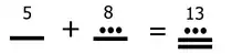 The Mayan numeral system was the system to represent numbers and calendar dates in the Maya civilization. It was a vigesimal (base-20) positional numeral system. The numerals are made up of three symbols; zero (a shell),[1] one (a dot) and five (a bar). For example, thirteen is written as three dots in a horizontal row above two horizontal bars; sometimes it is also written as three vertical dots to the left of two vertical bars. With these three symbols, each of the twenty vigesimal digits could be written.