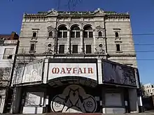 On the site rose a new Auditorium Theatre, built for $250,000,[2] which opened on September 12, 1904 with Keith's Vaudeville and moving pictures. It was designed by architectural firm J.D. Allen & Co. of Philadelphia. It was taken over by the Shubert Bros. in 1909 until 1913. Briefly operated by Poli, it returned to the Shuberts in 1918. The theatre remained mainly a playhouse, although occasional films were presented. In the summer of 1940, the Auditorium Theatre was remodeled again, this time to the plans of local architect E. Bernard Evander who built a new theatre within the shell of the former Auditorium, by gutting the Auditoriums interior between the dressing rooms and the front entrance and between the first floor and the bottom of the second balcony. He also added a false ceiling below the second balcony or a dropped ceiling that concealed the steeply sloped second balcony and decorative dome above it that still had artworks on it, by adding this false dropped ceiling it brought the towering vault of the Auditorium downward. New flooring was laid a new screen was installed a new Proscenium for the stage was installed and the lobby was completely remodeled. Most of the original designs of the Auditorium was saved due to the closing off of the second balcony above the false ceiling as well as the front and side walls. On the outside the facade was modernized with a new triangular marquee and a new improved box office counter in between the two outer doors leading into the main lobby. The 850 seat building reopened as the re-branded Mayfair Theatre on January 31, 1941 with the movie A Night at Earl Carroll's starring Ken Murray. By 1960 it had been equipped with 70mm projectors. Adjacent, just north of the Mayfair Theatre, a small parking lot marks the spot of the Stanley Theatre, Baltimore's once largest theatre until it was razed in May 1965.[3] The theatre itself closed on April 22, 1986. There was a hope of it reopening when the theatre was put up for auction in 1987 but the auction was cancelled when bidders offered no more than $200.000 for the property. Ever since then the building has been boarded up and deteriorated significantly since then.