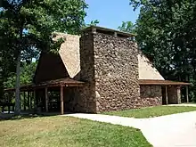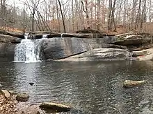 The park's Deshazo Mill access is its northernmost and second-developed area. The access has a small parking and picnic area, which serve as the trailhead for the Mayo River Trail.[4] The trail takes hikers past Fall Creek Falls, before reaching the Mayo River.[4] The trail then turns north and passes by the confluence of the North and South Forks of the Mayo, and it formally ends at Bryd's Ledge. Named for Mr Bryd, the rock formation in the North Mayo River was a landmark when the North Carolina–Virgina state line was surveyed.[4] An informal trail continues on into Virginia's Mayo River State Park.