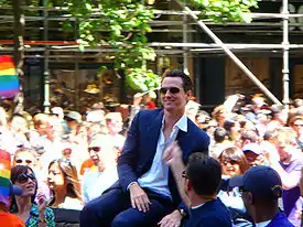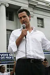 Proposition 8, the ban on same-sex marriage, was a big topic during the 2008 election, and Newsom was a prominent and vocal opponent.[10] In the months leading up to Election Day, Proposition 8 supporters released a commercial featuring Newsom saying the following words in a speech regarding same-sex marriage: "This door's wide open now. It's going to happen, whether you like it or not."[11] Some observers noted that polls shifted in favor of Proposition 8 following the release of the commercial; this, in turn, led to much speculation about Newsom's unwitting role in the passage of the amendment.[11][12][13][14][15] For instance, a January 2009 Newsweek article states: