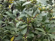 Leaves alternate, petiole 2–6 mm long,[1] leaves are elliptic-lanceolate 2–6 cm long and 1,5–3 cm wide, thick and leathery, apex and base are attenuate, irregularly toothed margins. Reddish and deciduous stipules. Flowers are hermaphrodite or unisexual, in groups of 2–3 in the axils; five sepals about 1 mm long; five petals wine colored in 2–3,5 mm, ovary reduced in male flowers with five stamens; in female, the ovoid ovary ends in a short style and this in its turn, in flat bi-lobed stigmas. Fruit capsule 6–8 long and 5 mm wide, two valves which contain 1 to 2 seeds.