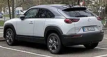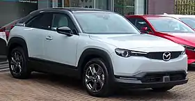 The Mazda MX-30 is an electric and hybrid compact crossover SUV produced by Mazda.[2] Based on the CX-30, it was unveiled at the 2019 Tokyo Motor Show.[3] Production of the vehicle, which is Mazda's first mass-produced electric car, began at their Ujina factory on 19 May 2020.[4]