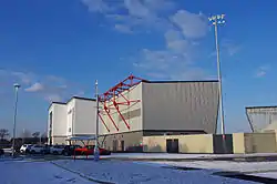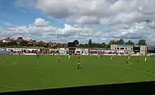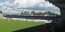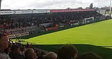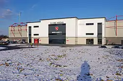 The Mazuma Stadium (formerly known as the Globe Arena for sponsorship reasons) is a football stadium in Morecambe, Lancashire, England, which is the home of Morecambe F.C.[1][2][3][4][5] The stadium replaced the old Morecambe F.C. stadium, Christie Park, which was Morecambe's home from 1921 to 2010. The stadium holds up to 6,476 supporters, with 2,173 seats available in the Main Stand, which runs the length of one side of the pitch. Opposite the Main Stand is an uncovered terrace with a capacity of 606, giving a similar feel to the ground as that at Christie Park. At either ends of the pitch are the home and away stands, with the home end holding a maximum of 2,234 supporters and the away end having a capacity of 1,389.[6] In the north east corner of the stadium is the Tyson Fury Foundation, which is split between two floors. The building also houses a gym, which was purchased by Tyson Fury in August 2020.