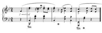 The piece starts with a short, bold theme and is soon followed by a section in question and answer. This phrase is then completed with a descending sequence. This main theme then repeats in two different new keys, one after the other. The Mazurka then finishes with a slower section and the main theme repeated once more. There is then a D.C. al fine and the whole piece then starts again and finishes at the start of the final, slower section with a B-flat chord in octaves.[3]