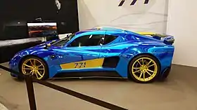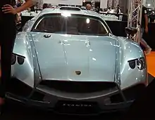 The Evantra Pura was revealed at the 2021 Florence Biennale art festival in Florence.[25] It shares its engine with the 781, that being a supercharged 6.2L LT2 that produces 761 hp (772 PS; 567 kW) at 6,300 RPM and 910 N⋅m (671 lb⋅ft) at 4,300 RPM.[26] The manufacturer claims that the Pura can accelerate from 0–62 mph (0–100 km/h) in 2.9s, with a top speed of over 360 km/h (224 mph).[27] The Pura is considered the entry model within the Evantra series and has more emphasis on lightness and sheer driving pleasure, in fact the car weighs only 1,290 kg (2,844 lb), sitting a chassis of high-tensile steel, and molybdenum chrome which allows for flexibility in the corners.[25][28] The car has MacPherson struts at each corner of the vehicle with fully adjustable suspension as an option.[28] Stopping power is provided by provided by carbon-ceramic Brembos, with 6-piston calipers and 14.9 in (378 mm) rotors at the front, and 4-piston calipers and 14 in (356 mm) rotors at the rear.[25] The car is fitted with OZ Racing wheels, with the fronts measuring 9.5 in (24 cm) by 19 in (48 cm) at the front and 12 in (30 cm) by 20 in (51 cm) at the rear, shod with 255/35R19 and 315/30R20 Michelin rubber respectively.[26][28] Power is sent to the rear wheels via a 7-speed sequential paddle-shift gearbox.[25]