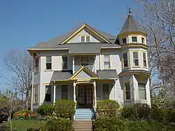 The McBride–Hickey House exemplifies the stylistic transition that happened in architecture in Davenport at the turn of the 20th century.[2] The main block of the structure features a symmetrical, five-bay facade. The placement of the center bay, porch, and roof dormer contribute to the symmetry and suggest the Georgian Revival style. The asymmetry of Victorian architecture is found in the polygonal bays and a 3-stage corner tower. The Eastlake style porch and shingled dormer also add interest to what is basically a Georgian Colonial Revival facade.