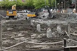 The announcement forced 244 residents and several businesses to vacate the building by the end of 2010.[7] A floor-by-floor demolition of the McGuire Apartments building, as opposed to the implosion method used for Seattle's Kingdome in 2000,[8] was approved by the City of Seattle in March 2011.[9] Contractor Lease Crutcher Lewis began salvage and demolition work on April 4, 2011,[10][11] with the garage leveled beginning the following month.[7] The demolition was completed in early 2012,[12] and claimed the life of a construction worker during work on the 22nd floor in September 2011.[13]
