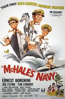 McHale's Navy is a 1964 technicolor comedy film based on the 1962–1966 black and white television sitcom McHale's Navy starring Ernest Borgnine, Tim Conway and Joe Flynn, which had in turn originated with a one-hour anthology drama starring Borgnine entitled Seven Against the Sea. The film version was directed by series producer Edward Montagne and its supporting cast includes Carl Ballantine, Gavin MacLeod, Jean Willes, Claudine Longet, and George Kennedy. The film was followed by a sequel entitled McHale's Navy Joins the Air Force which did not feature Borgnine or Carl Ballantine. A remake entitled McHale's Navy, was released in 1997 and features an appearance by Ernest Borgnine playing a 75-year old McHale. The filming location for New Caledonia is the same as the one used in the series. For more information on the main characters see the TV series McHale's Navy. The movie was released on DVD for Region 1 on January 31, 2011.[2]