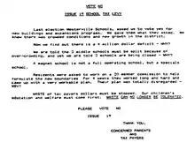 On the evening of April 27, 1988, the superintendent of Westerville City School District held a public meeting at Blendon Middle School in Westerville, Ohio, to discuss a new school district tax levy. On the same day, an Ohioan named Margaret McIntyre stood outside the school and distributed leaflets to meeting attendants, asking them to vote no on the tax levy issue. Some of the leaflets did not identify her as the author, instead identifying the message as coming from "concerned parents and tax payers".[13]