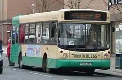 In late 2006 the company bought its first new vehicles: two BMC Falcons and a King Long single-decker.[8] Their three express services were run with Volvo B10M and Dennis Javelin coaches. Three older vehicles, a Bristol Lodekka, an MCW Metrobus and an AEC Routemaster, were preserved by the company. McKindless had also bought ex-Hutchison Optare Excels to use on local routes in Wishaw, still in the livery of their previous. In July 2009, McKindless loaned an Alexander Dennis Enviro400 double-decker for demonstration purposes.[9]
