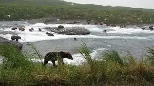 McNeil Falls has always been famous for its bear watching, and as early as 1955, when it was closed to hunting, it was featured in an article of National Geographic by Cecil E. Rhode and in the 1956 documentary The Animal World. Bear watching at the falls reached a low in the mid-1970s due to limited rules and human interference, but with better rules, bear numbers increased. As many as 100 bears may be seen at the falls in a single day with frequent sights of 60 or more at one time.[7] Visitors often view bears as they stand at the falls waiting to catch salmon in their mouths. In addition to the main McNeil River, Mikfik Creek to the south and Chenik Lake to the north, in the refuge, also provide bear viewing. Both Mikfik Creek and Chenik Lake offer best bear viewing in June and McNeil River does in July.[4]