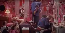 A music video for "Me & You Together Song", directed by Bedroom, was released on 6 February 2020.[67] Filmed in a retro style reminiscent of 1990s music videos, it includes homages to 1990s culture such as mix CDs, boomboxes, Converse', rooms covered in band posters, and retro T-shirts.[68][33] The music video begins with a young woman inserting a CD mixtape into her boombox before dancing on her bed. The video pivots to a house party as the song progresses, while scenes of the band performing are interspersed.[67] The bedrooms are shown to be interconnected, while at the same time the partygoers begin locking eyes with each other.[69] As the couples in the bedrooms and the party begin making out, the 1975 are shown performing in the house and the partygoers gather around them.[70] As the video concludes, the entire apartment in which the video takes place is shown to be built on a sound stage.[69]