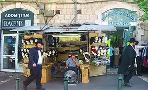 Today, Mea Shearim remains an insular neighbourhood in the heart of Jerusalem.[4] With its Haredi, and overwhelmingly Hasidic, population, the streets retain the characteristics of an Eastern European shtetl,[1] as it appeared in pre-war Europe. Life revolves around strict adherence to Jewish law, prayer, and the study of Jewish religious texts. Traditions in dress include black frock coats and black hats for men (although there are some other clothing styles, depending on the religious sub-group to which they belong), and long-sleeved, modest clothing for women. In some Hasidic groups, the women wear thick black stockings all year long, even in summer. Married women wear a variety of hair coverings, from wigs to scarves, snoods, hats, and berets. The men have beards, and many grow long sidecurls, called peyot. Many residents speak Yiddish in their daily lives, and use Hebrew only for prayer and religious study, as they believe Hebrew to be a sacred language, only to be used for religious purposes.[5]
