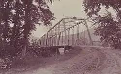 The Meadow Bridge was a historic bridge across the Androscoggin River located on a spur of North Road in Shelburne, New Hampshire. It was a multi-span pin-connected truss bridge that was the first on its site when it was built in 1897 by the Groton Bridge and Manufacturing Co. The bridge consisted of three central through Pratt trusses, one pony Pratt truss, and one steel girder section. The ends of the bridge rested on stone abutments, while the interior spans were supported by circular steel piers filled with concrete and anchored in place by timber piles. The bridge was bypassed in 1984 by a modern bridge.[2] In 2004 it was dismantled and stored on the banks of the river for future rehabilitation.[3]