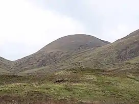 The hill just qualifies as a Munro by four metres, reaching a height of 918 m (3,012 ft). In the original 1891 version of Munro's Tables, Meall na Teanga was listed as a subsidiary "Top" of Sròn a' Choire Ghairbh. It was promoted to Munro status when the tables were updated in 1921, despite continuing doubts as to whether it had sufficient height.[3] The hill's name translates from the Gaelic as "Hill of the Tongue". This refers to one of the hill's ridges: either the long tongue-like western ridge which curves round two fine corries, or the steep buttressing spur which rises from the loch to the summit.[4] The hill is sometimes referred to in the anglified form of "Tango".