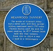 The Meanwood Valley was a place of industry as long ago as 1577 and it continued to the 19th century. The Meanwood Beck provided water and power for corn, flax and paper mills, dye works and tanneries. There were numerous quarries.[1]