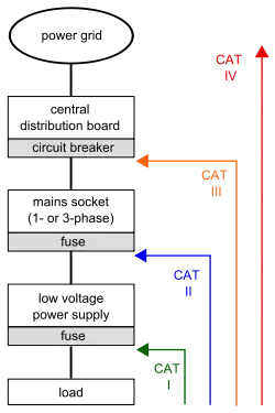 Measuring circuits are subjected to working voltages and transient stresses from the circuit to which they are connected during measurement or test. When the measuring circuit is used to measure mains, the transient stresses can be estimated by the location within the installation at which the measurement is performed. When the measuring circuit is used to measure any other electrical signal, the transient stresses must be considered by the user to assure that they do not exceed the capabilities of the measuring equipment. In this standard, circuits are divided into the following measurement categories:[2]