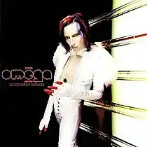 Contrary to popular internet rumors, the band leader, Manson, did not undergo any plastic surgery for this androgynous, alien look. The breasts are prosthetic, manufactured specially by Screaming Mad George's SMG Effects (now out of business).[28] Manson is, in reality, naked and covered head to toe in latex paint, provided by the same movie make-up company. His genitalia are covered by a foam latex appliance to create the androgynous appearance of the alien figure he calls Omēga, which, the singer explained, represents "sexlessness and vulnerability," in addition to his own "affection for prosthetic limbs."[28] Originally the make up consisted of six breasts with nipples. Manson has stated in interviews that his friend, actor Johnny Depp, is the current owner of these prosthetic breasts, which Manson traded for Depp's strawberry-blonde wig worn in the 2001 film Blow.[30]