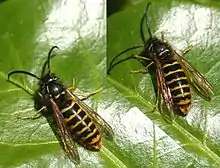 The median wasp (Dolichovespula media) is a species of social wasp of the family Vespidae found throughout Europe and Asia.[3] It builds aerial paper nests often in shrubs or trees, and occasionally under the eaves of buildings.[4] It is most common to see this wasp between May and October during its 3.3 month colony cycle.[3][5] Behaviours of this wasp include nest defense, curling which is believed to function in brood incubation, and gastral vibration which is involved in larval feeding.[6] The median wasp has a halplodiploid sex determination system that results in a high level of relatedness within the colony.[7] This species is not usually aggressive but will sting if they feel their nest is threatened.[8] Most foraging in the nest is done by the workers once the first ones reach adulthood. These workers forage for insects, nectar, and wood for nest construction in temperatures as low as 7 °C (45 °F).[8] The median wasp is known to be occasionally affected by the fungus Cordyceps sphecocephala and the Cricket paralysis virus.[9]