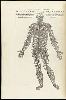 Vesalius was a Flemish-born anatomist whose dissections of the human body helped to rectify the misconceptions made in Ancient Times, particularly by Galen, who (for religious reasons) had been able only to study animals such as dogs and monkeys. He wrote many books on anatomy from his observations; his best-known work was De humani corporis fabrica, published in 1543, which contained detailed drawings of the human body posed as if alive.[8] This book contained many different anatomic sketches that he made upon examining and dissecting cadavers. These sketches were a combination of Italian and Gothic art.