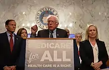 While advocates of a public option agree with single-payer proponents that the United States should provide universal health care, they disagree on the solution, asserting that Americans are not interested in a government-run health care system and want to be able to keep their private health insurance.[55] Critics who support single-payer instead charge that offering a public option to compete with private insurance would create a two-tiered system of concierge versus minimal medical services, as private for-profit insurance companies use political muscle to deny coverage to the oldest and sickest Americans, thus shunting the more expensive patients onto a financially vulnerable public option.[56] Medicare for All proponents also say a hybrid system of private insurance coupled with a public option would result in added bureaucracy and paperwork, and therefore fail to lower health care costs.[57]