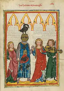 The early 14th century Codex Manesse from Heidelberg has miniatures of many Minnesang poets of the period. The portrait of Heinrich von Stretelingen shows him engaged in a "courtly pair dance" while the miniature of Hiltbolt von Schwangau depicts him in a trio dance with two ladies, one in each hand, with a fiddler providing the music.[48]