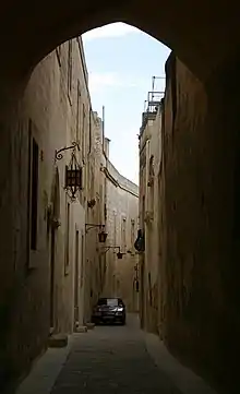 A medina quarter (Arabic: المدينة القديمة al-madīnah al-qadīmah "the old city") is a distinct historical city section found in a number of North African cities, and in Malta. A medina is typically walled, with many narrow and maze-like streets.[1] The word "medina" (Arabic: مدينة madīnah) itself simply means "city" or "town" in modern-day Arabic. It is cognate with the Aramaic-Hebrew word (also "medina") referring to a city or populated area.