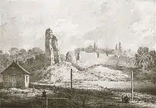 Medininkai Castle (Lithuanian: Medininkų pilis), a medieval castle in Vilnius district, Lithuania, was built in the first half of the 14th century. The defensive perimeter of the castle was 6.5 ha; it is the largest enclosure type castle in Lithuania.[1][2] It was built on plain ground and was designed for flank defence. The rectangular castle's yard covered approximately 1.8 hectares and was protected by walls 15 metres high and 2 metres thick. The castle had 4 gates and towers. The main tower (donjon), about 30 metres high, was used for residential quarters. Medininkai was first mentioned in 1392.[3] The castle was badly damaged by a major fire in the late 15th century. Because of increased use of firearms, this type of castle was no longer suited for defensive purposes and was later used as a residence. During the 17th–18th centuries it was reorganized into a farm and a bakery. After the castle's restoration, its museum currently exhibits large collection of items made from silver by artisans of the Grand Duchy of Lithuania,[4] and collection of hunting trophies and hunting knives of President Algirdas Brazauskas.[5]