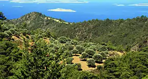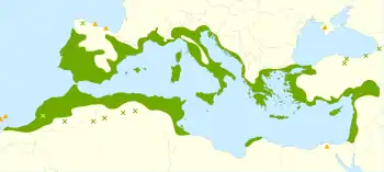 She defines this region as coextensive with the range of the olive tree: "those blessed lands of sun and sea and olive trees".[2] The olive's natural distribution is limited by frost and by availability of water. It is therefore constrained to a more or less narrow zone around the Mediterranean Sea, except in the Maghreb and in Spain, where it is distributed more widely, and on the islands of the Mediterranean, where it is widespread.[5][2]
