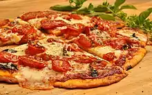 Pizza, or as David notes "pissaladina or pissaladière" in Provence (the cuisines of Mediterranean France and Italy having something in common), is a piece of bread dough rolled out thin, with a topping which varies from place to place, but is generally much simpler than those in the English-speaking world.[78][79] In Naples this is tomato, anchovies and buffalo mozzarella. In San Remo it is onions cooked in olive oil, with salted sardines. The Provençal variety uses onions, black olives, and anchovies.[75]