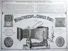 The megalethoscope is an optical apparatus designed by Carlo Ponti of Venice before 1862.[1] The megalethoscope is the evolution of the alethoscope, patented by Ponti in 1861.