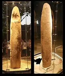 As well as abstract or geometric art, some carvings are considered to represent tools, weapons, animals, human figures, deities or idols. The gallery graves of the Seine-Oise-Marne culture such as that at Courjeonnet have images of axes, breasts and necklaces carved on their walls.[2] The meaning of some of these is disputed. For instance, some of the tombs in the valley of the Petit Morin in France and elsewhere contain engravings of breasts, noses, hair, and a collar or necklace. These have been described both as deities (occasionally as 'dolmen deities') and as representations of the deceased.[3]