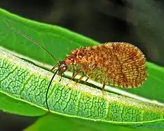 Adults are in flight between April to October (these insects partly overwinter).[4][5] Like their relatives, they are predominantly twilight and nocturnal. Adults mainly feed on aphids, tree sap and honeydew, where as larvae are active predators on aphids and bark lice.[5]