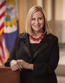 Megan Christine Barry[1] (née Mueller; born September 22, 1963) is an American businesswoman and politician[2] who served as the seventh mayor of the Metropolitan Government of Nashville and Davidson County[3] from 2015 until March 6, 2018, when she resigned after pleading guilty to felony theft related to an extramarital affair with a city employee who had served as the head of her security detail.[4] Barry is a member of the Democratic Party.
