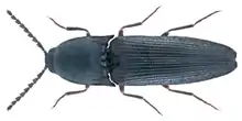 Adults of Megapenthes lugens grow to a length of 7–10 millimetres (0.28–0.39 in),[1] with a broad pronotum (the dorsal sclerites of the anterior segment of the thorax). The beetle's antennae extend marginally beyond the posterior of the pronotum when laid across the dorsal sclerites. The whole beetle is black in colour. The elytra gradually taper, and bear pronounced longitudinal rows of scored markings.
