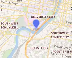The field is about half a mile south-southeast of Franklin Field, along the eastern edge of the university's campus, along the Schuylkill River. The ballpark is tucked away near the intersection of the Schuylkill Expressway and University Avenue. The CSX railroad tracks run behind home plate and are still in use. I-76 (the Schuylkill Expressway) runs parallel to the outfield wall with exit 41 visible from home plate. The right field foul line is kept tight by a large power plant that has two rising cooling tanks and a fence around its perimeter.[2] River Field Drive, which fronts the railroad tracks to the north, is so close that there are only a couple of rows of seats available on the third base side.