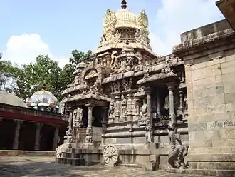 This Karakkoil was built by emperor Kulottunga Chola I in the year 1113 AD, the king's 43rd governing year.[2] This temple is like a chariot like structure with two horses pulling the car or Ratha. The temple is finely sculptured with many purana stories like Ramayan, Krishna Leela, Nayanmar stories and other stories of siva.