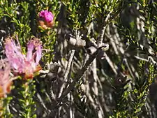 The flowers are arranged in heads at the ends of branches, with the branch continuing to grow after flowering. Each head has 1 to 4 groups of flowers in pairs or threes. The stamens are arranged in five bundles around each flower, 6 to 12 stamens per bundle, coloured pink, purple or magenta. Flowering occurs in September and October and the fruit which follow are woody capsules 4.8–6.5 mm (0.2–0.3 in) long.[2][3]