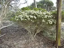 The flowers are white when young but turn reddish as they age. They are in heads at or near the ends of the branches which continue to grow after flowering. Each head contains 2 to 10 individual flowers and is about 15–20 mm (0.6–0.8 in) in diameter. Flowers appear in September and October and the fruit which follow are cylindrical or barrel-shaped woody capsules which retain the sepals as teeth around the edge. The fruit are 5–6 mm (0.20–0.24 in) long and 4–5 mm (0.16–0.20 in) in diameter.[2][3]