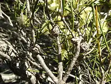 The flowers are arranged in heads 10–15 mm (0.4–0.6 in) across on the ends of the branches and in leaf axils, each head containing 4 to 18 groups of three flowers. The flowers are cream to white or yellow with petals that fall off as the flower opens or soon after. The stamens are arranged in five bundles around the flower, each bundle containing 3 to 9 stamens. Flowering occurs from August to November, mainly October and November and the fruit that follow are woody capsules in tight, almost spherical clusters up to 9.8 mm (0.4 in) in diameter and each fruit about 2–4 mm (0.08–0.2 in) in diameter.[2][3][4]