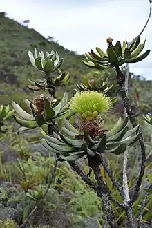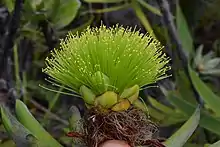 The flowers are bright green or yellowish-green and are in almost spherical heads at the ends of branches which continue to grow after flowering. The petals are 2.8–5 mm (0.1–0.2 in) long, the sepals are fringed with hairs and are 2.3–2.8 mm (0.09–0.1 in) long and there are 15 to 20 stamens per flower, occasionally with some stamens fused near their base but more usually entirely free. Flowering occurs throughout the year and is followed by fruit which are cup-shaped, slightly hairy, woody capsules.[2][3]