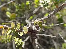 The flowers are yellow or greenish-yellow and arranged in heads or spikes on the ends of branches which continue to grow after flowering, sometimes also on the sides of the branches. The heads are up to 25 mm (1 in) in diameter and composed of 5 to 20 individual flowers. The petals are 2.5–3.5 mm (0.098–0.14 in) long and fall off as the flower ages. There are five bundles of stamens around the flower, each with 7 to 15 stamens. Flowering occurs mainly in early spring and is followed by fruit which are woody capsules 3.5–5 mm (0.14–0.20 in) long.[2][3]