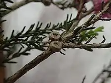 This species flowers profusely with deep pink flowers in clusters along the stems. The clusters contain between 4 and 15 individual flowers and are up to 12 mm (0.5 in) in diameter. The petals are 1.2–2.3 mm (0.05–0.09 in) long and fall off soon after the flower opens. The stamens are arranged in five bundles around the flower, each bundle containing 4 to 12 stamens. Flowering occurs in early spring and is followed by the fruit which are woody capsules 2.6–3 mm (0.10–0.12 in) long in loose clusters along the stem.[2][3]