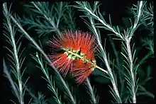 Melaleuca lateritia is an erect shrub growing to about 2.5 m (8 ft) high, to 3 m (10 ft) wide. The leaves are light green, thin, linear, concave and glabrous, 6–25 mm (0.2–1 in) long, 1–2 mm (0.04–0.08 in) wide and with a pointed tip. They are spirally arranged around the stem.[2][3]