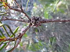 The flowers are a shade of pink to purple and are arranged in heads on the ends of most of the branches, which continue to grow after flowering. The heads are up to 55 mm (2 in) in diameter but more usually about half that size, and contain 10 to 20 groups of flowers in threes. The stamens are in five bundles around the flower, each bundle with 7 to 13 stamens. Flowering usually occurs in September or October and the fruit which follow are woody capsules 3–6 mm (0.1–0.2 in) long in roughly spherical clusters along the stems.[2][3]