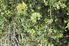 The flowers are arranged in heads or short spikes containing 3 to 12 individual flowers, the spike about 20 mm (0.8 in) wide. They are greenish-yellow with the stamens arranged in five bundles around each flower, the bundles containing 11 to 18 stamens. The flowering season is in autumn and winter and is followed by fruit which are woody capsules 3.5–4 mm (0.1–0.2 in) long.[2][3][4]