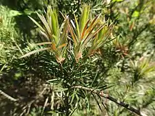 Melaleuca subulata is a shrub growing to 1–2 m (3–7 ft) high with hard, fibrous bark. Its leaves are arranged alternately and are 18–50 mm (0.7–2 in) long, 1–3.1 mm (0.04–0.1 in) wide, cylindrical or shaped like a bradawl.[4][5]